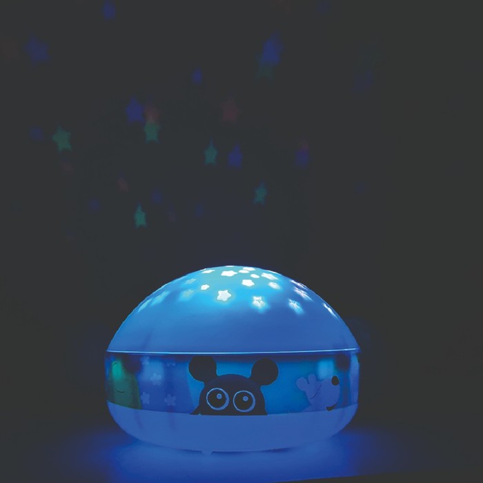 Denna nattlampa lyser upp väggar och tak med stjärnor i olika färger. Den har en dimmerbar ljusstyrka som dimmas med en knapp på undersidan. Den inbyggda speldosan spelar en instrumental version av Babblarnas sövande vaggvisa.