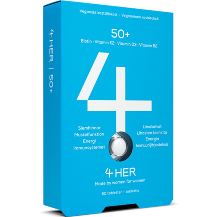4Her 50+ är ett kosttillskott med vitamin D, biotin och riboflavin (vitamin B2), speciellt utvecklat för kvinnor över 50 år.