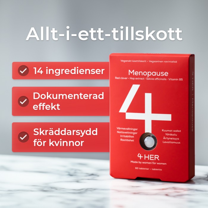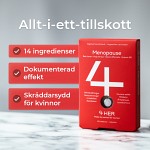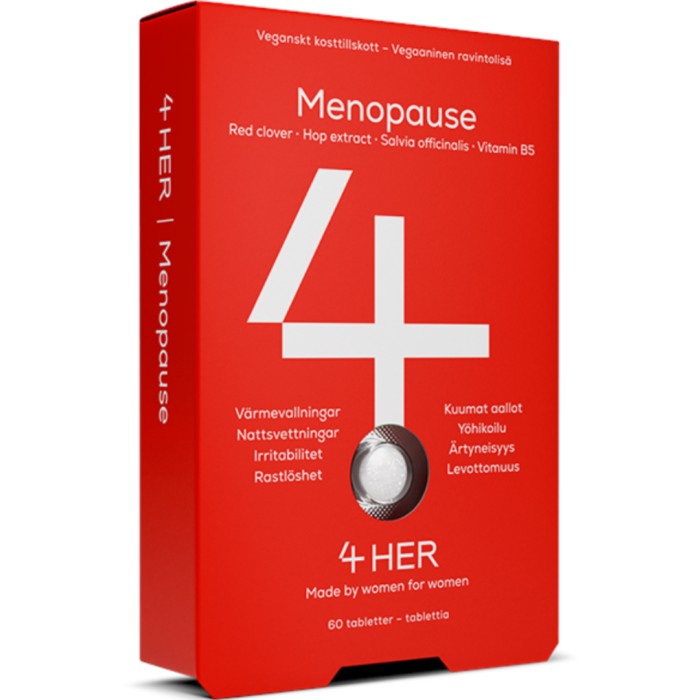 4Her Menopause är ett kosttillskott utvecklat för kvinnor som är i klimakteriet. 4Her Menopause innehåller extrakt från rödklöver, humle och salvia samt flera vitaminer och mineraler.