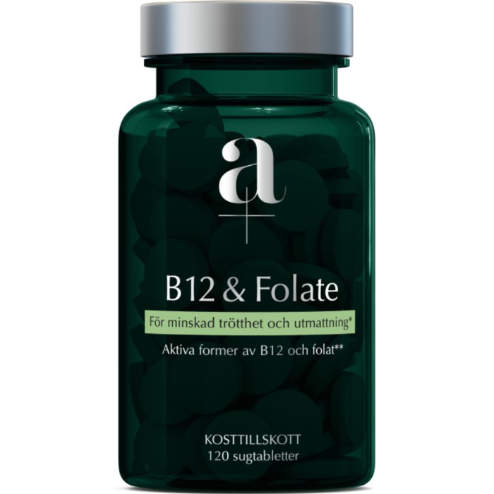 B12 & Folate är ett kosttillskott från A+ som innehåller metylerade former av vitamin B12 och folat. Vitamin B12 bidrar till normal bildning av röda blodkroppar. Folat bidrar till normal blodbildning. Vitamin B12 och folat bidrar båda till att minska trötthet och utmattning. Kolin bidrar till omsättningen av homocystein. Innehåller sötningsmedel.