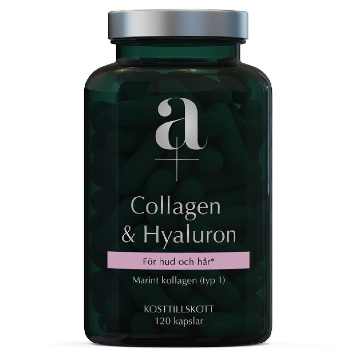 A+ Collagen & Hyaluron är ett kosttillskott som innehåller marint Typ I-kollagen från fisk, hyaluronsyra, kisel från bambuextrakt, C-vitamin samt biotin och riboflavin. Kollagen utgör ca 25 – 35 % av allt protein i kroppen och finns naturligt i bland annat hud, hår, naglar, benvävnad och brosk. Hyaluronsyra är ett ämne som finns naturligt i huden. Bambuextrakt innehåller 70 % kisel som förekommer i all elastisk kroppsvävnad.