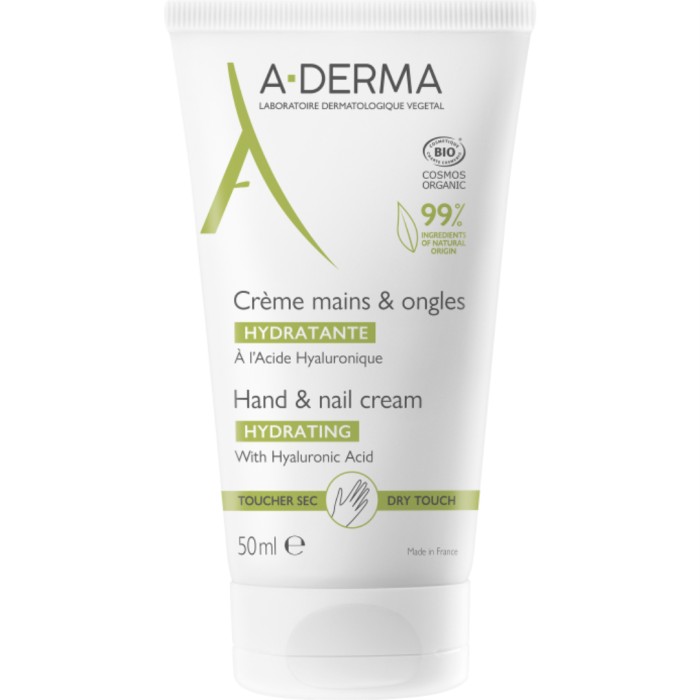 A-Derma Hand & Nail Cream är en återfuktande kräm för händerna och naglarna, Handkrämen innehåller hyaluronsyra och återfuktar, ger näring till, reparerar och lindrar huden på händerna. Krämen hjälper även till att stärka naglarna. Innehåller 99,8% naturliga ingredienser. Vegansk.