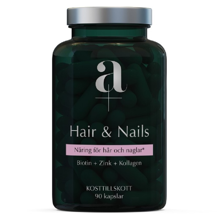 A+ Hair & Nails är ett kosttillskott som innehåller väl utvalda näringsämnen för hår och naglar. Detta kosttillskott innehåller bland annat en kombination av kollagen och MSM som båda är viktiga komponenter i kroppens vävnader.