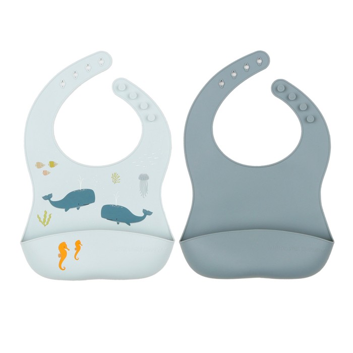 Haklapp-set Ocean från A Little Lovely Company är två praktiska silikonhaklappar - en med Ocean-tryck och en matchande enfärgad haklapp.