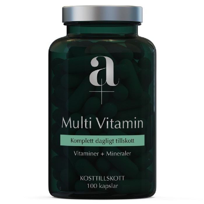A+ Multi Vitamin är ett multivitamin- och mineraltillskott som kombinerar vitaminer, mineraler, citrusbioflavonoider och kolin. A+ Multi Vitamin innehåller B12-vitamin, C-vitamin och pantotensyra som bidrar till att minska trötthet och utmattning. Pantotensyra bidrar dessutom till normal mental prestationsförmåga. Magnesium bidrar till normal muskelfunktion.