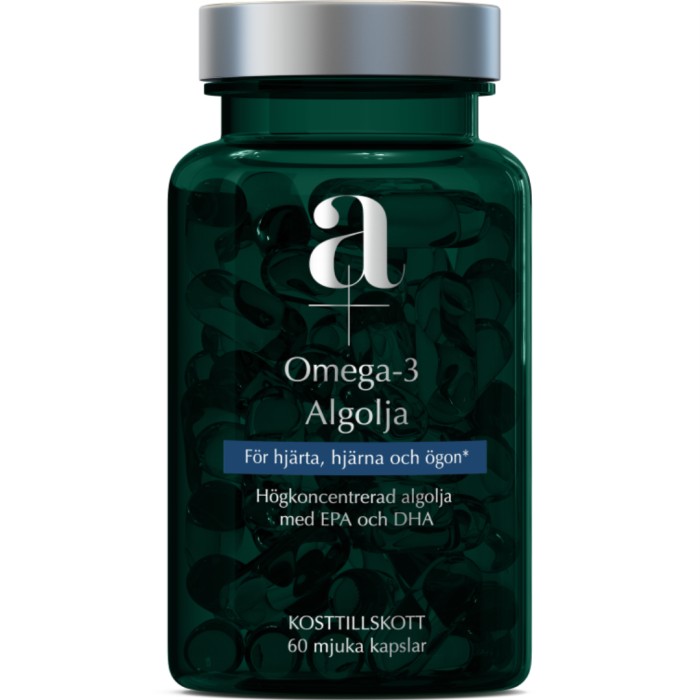 A+ Omega-3 Algolja är ett kosttillskott som innehåller olja från alger som odlats fram i slutna kontrollerade system. Alger är en källa till de essentiella fettsyrorna EPA och DHA. EPA och DHA bidrar till hjärtats normala funktion. Effekten uppnås vid ett dagligt intag av minst 250 mg EPA och DHA. DHA bidrar till att bibehålla normal hjärnfunktion och normal syn. Den gynnsamma effekten uppnås vid ett dagligt intag av 250 mg DHA.