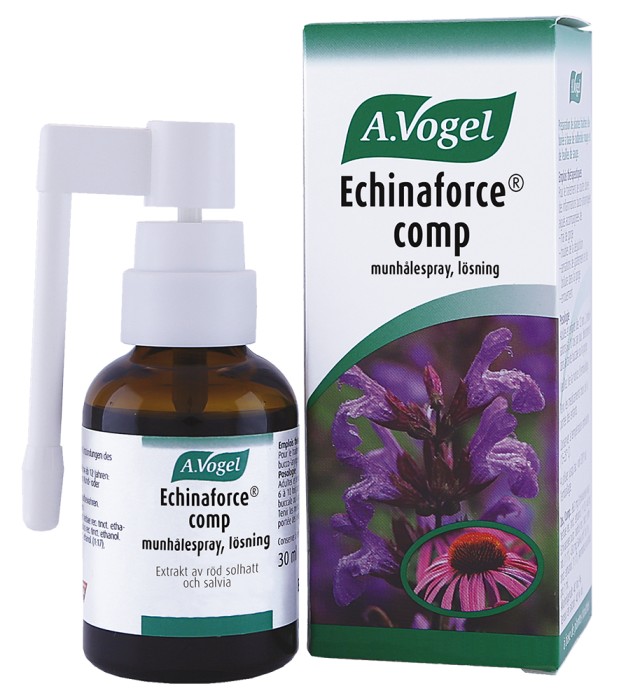 Echinaforce Comp innehåller läkeörterna echinacea och salvia och är en munhålespray som behandlar exakt det område där du har ont. Sprayen innehåller extrakt av ekologiskt odlad och färsk extraherad echinace samt salvia som traditionellt använts för att lindra irriterande och smärtande slemhinnor, framförallt i hals och svalg.