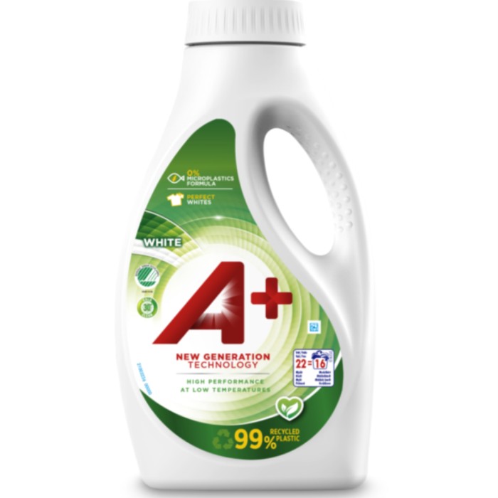 A+ White flytande tvättmedel har en innovativ formulering för fläckborttagning och tvätt och ger ett bra resultat även vid låga temperaturer. A+ White är utvecklad speciellt för vita kläder, så att intensiteten i de vita kläderna bevaras. (Använd ej på ylle eller silke.)