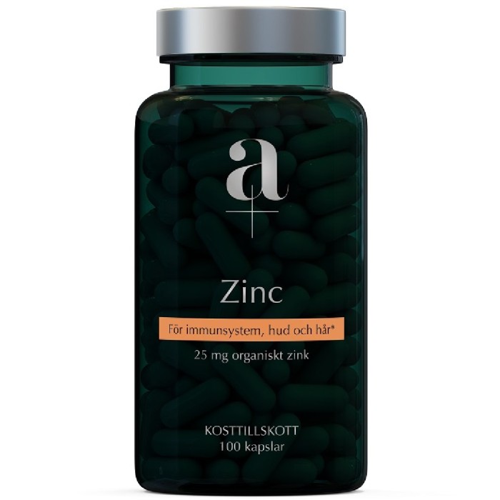 A+ Zinc är ett kosttillskott som består av tre lättupptagliga zinkformer med zinkcitrat, zinkglukonat och zinkbisglycinat. Varje kapsel ger 25 mg organiskt zink.