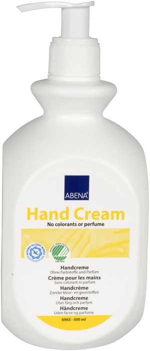 Abena Handkräm är en mild och vårdande handkräm för normal hud. Handkrämen absorberas snabbt av huden och känns inte fet. Abenas handkräm innehåller glycerin som bibehåller fukt i huden, och krämen innehåller 21 % fett. Utan färgämnen och parfym.