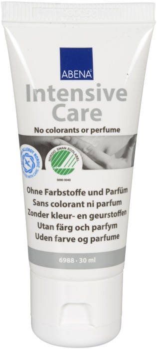 Abena Intensive Care är en hudsalva som är lämplig för alla hudtyper och hjälper till att bevara hudens naturliga fuktnivå. Intensive Care hudkräm är extra lämplig för mycket torr och irriterad hud. Den rika lipidhalten (70 %) hjälper till att förbättra hudens barriär. Krämen kan användas på händer, kropp, ansikte och även på fötterna, tack vare den höga fetthalten. Krämen har goda barriäregenskaper direkt vid appliceringen och i upp till 8 timmar.