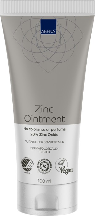 Abena Zinksalva är avsedd för hudvård där det finns behov av skyddande barriär. Salvan innehåller 20 % zinkoxid och bidrar till att lugna huden. Salvan lämnar en skyddande barriär på huden i upp till 8 timmar och minimerar kontakten med vätskor och avföring. Kan användas av personer som använder inkontinensprodukter, och på spädbarn med blöjutslag. Zinksalvan tillför mycket fukt till huden och innehåller allantoin som lugnar huden.