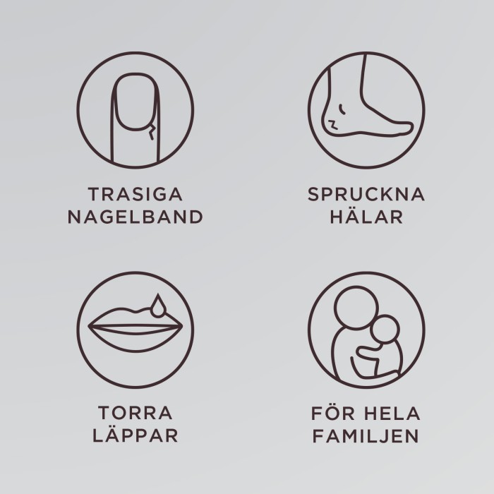 Applicera vid behov på torra och nariga hudpartier så som armbågar, hälar, knogar, nagelband, kinder och läppar.