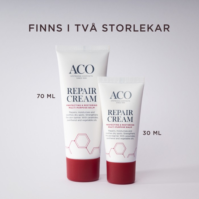 ACO Repair Cream är en skyddande och reparerande kräm för mycket torra hudpartier på kroppen och i ansiktet. Krämen har ett högt fettinnehåll och bildar ett skyddande lager på torr, narig och skadad hud. Repair Cream verkar även återfuktande och lugnande och reparerar torr hud. Har en kliniskt bevisad effekt att stödja hudens egna reparationsprocess och att stärka hudbarriären.