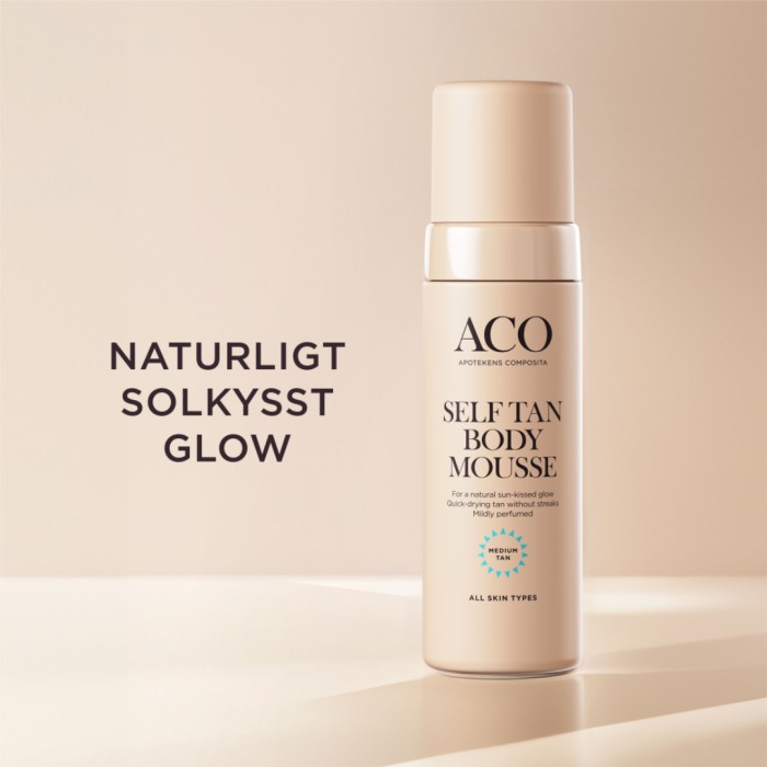 ACO Self Tan Body Mousse är en brun-utan-sol som ger huden en jämn och naturlig solkysst färg - utan att du behöver utsätta den för solens strålar. Moussen ger en färg som håller i upp till 7 dagar. Flera appliceringar ger en djupare färg. Self Tan Body Mousse innehåller återfuktande glycerin. Brun utan sol-moussen är lätt att applicera, torkar snabbt och lämnar inga fläckar på textilier. Vegansk formulering. Milt parfymerad.