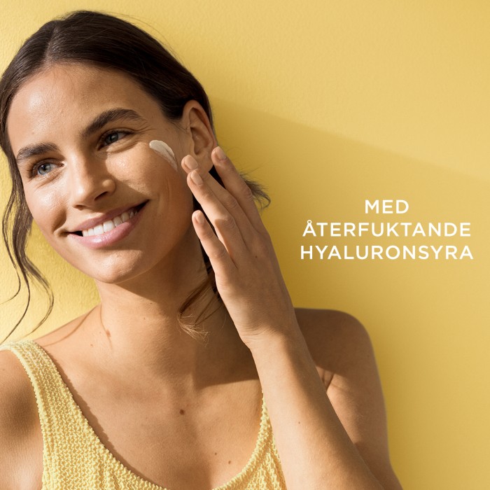 Sun Face Cream Age Defense innehåller niacinamid för att reducera existerande hyperpigmenteringar och öka hudens elasticitet. Hyaluronsyra återfuktar huden på djupet och peptid bidrar till kollagenproduktionen för fastare hud. Dermatologiskt testad. Oparfymerad.