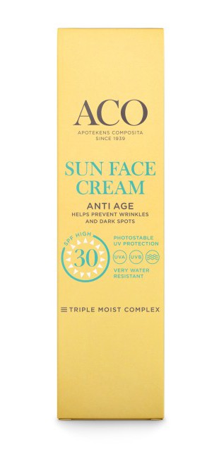 ACO Sun Face Cream Anti Age SPF 30 är en solskyddskräm för ansiktet. ACO Sun Face har ett förhöjt UVA-skydd för att hjälpa huden att bättre stå emot tecken på för tidigt åldrande som kan orsakas av solen. Solkrämen innehåller vitamin C och E samt Q10 som ger ett antioxidantskydd mot fria radikaler.