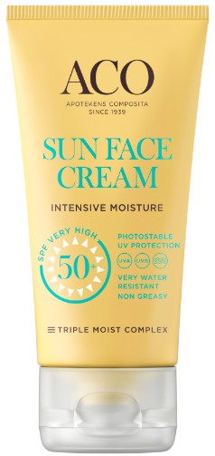 ACO Sun Face Cream SPF 50+ är en intensivt återfuktande solkräm för ansiktet som ger ett omedelbart skydd mot solens UVA- och UVB-strålar. Ansiktskrämen går snabbt in i huden utan att kladda och är extra vattenresistent. Solkrämen innehåller ACO:s Triple Moist Complex som ger en långvarig återfuktning av huden. Framtagen för att passa även känslig hud.