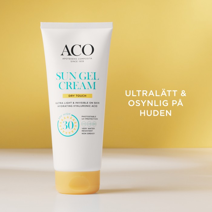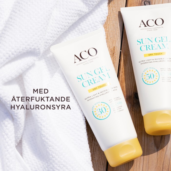 ACO Sun Gel-Cream SPF 30 är en ultralätt gel-solkräm med högt skydd som känns lätt och behaglig på huden. Solkrämen skyddar huden mot solens strålar med bredspektrumskydd och fotostabila UVA- och UVB-filter. Krämen har SPF 30 (högt skydd) och innehåller hyaluronsyra som verkar återfuktande på huden.