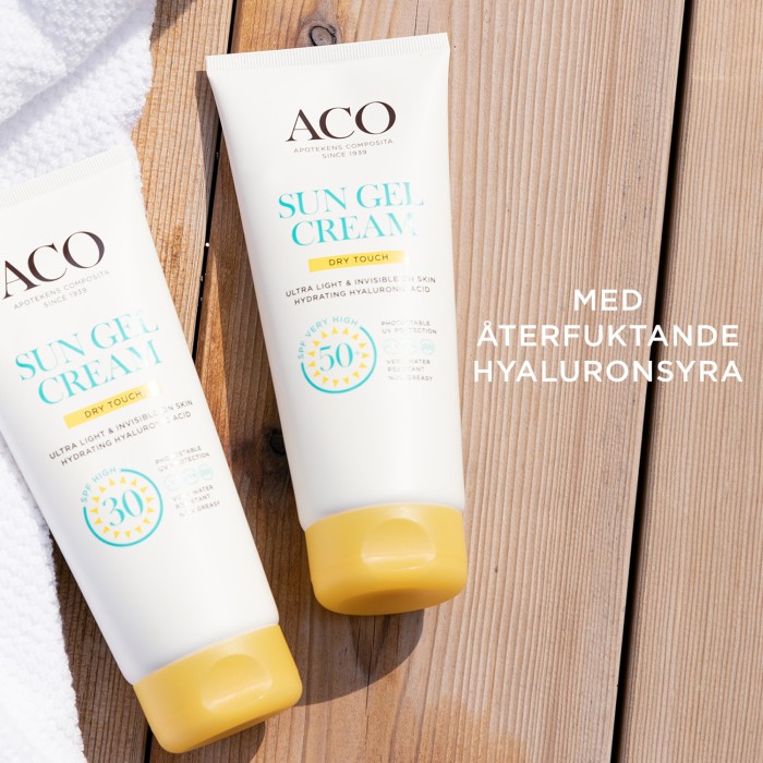 ACO Sun Gel-Cream SPF 50+ är en ultralätt gel-solkräm med högt skydd som känns lätt och behaglig på huden. Solkrämen skyddar huden mot solens strålar med bredspektrumskydd och fotostabila UVA- och UVB-filter. Krämen har SPF 50+ (mycket högt skydd) och innehåller hyaluronsyra som verkar återfuktande på huden.