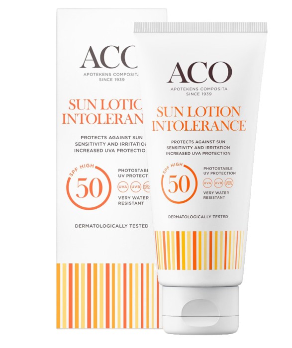 ACO Sun Lotion Intolerance SPF50 är en återfuktande solkräm för solkänslig hud. Intolerance solkräm skyddar och lugnar huden vid irritation orsakad av solen. Solskyddet innehåller ett utökat UVA-skydd och passar även dig som har problem med solallergi eller soleksem. Solkrämen kan användas både på kroppen och till ansiktet.
