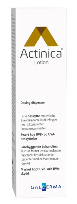 Actinica Lotion är en medicinteknisk produkt som förebygger icke-melanom hudcancer (NMSC) hos personer med ökad risk att utveckla detta. Actinica Lotion ger ett högeffektivt skydd mot både UVB- och UVA-strålning. SPF 50.