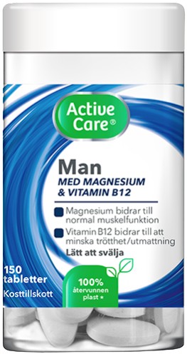 Active Care Man är ett kosttillskott anpassat för mannens behov av vitaminer och mineraler. Active Care Man innehåller bland annat vitamin B6 och B12 som bidrar till minskad trötthet och utmattning, och magnesium som bidrar till normal muskelfunktion.