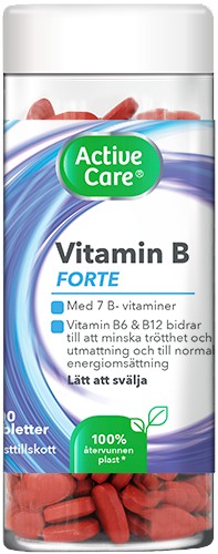 Active Care Vitamin B Forte är ett kosttillskott som innehåller vitamin B6 och B12. Vitamin B6 och B12 bidrar till att minska trötthet och utmattning och bidrar till en normal ämnesomsättning.