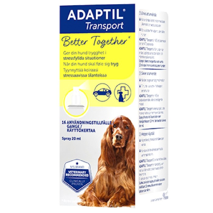 Med Adaptil Transport Spray blir resor och veterinärbesök mindre stressande för hunden. Använd vid bilresor eller veterinärbesök. Kan sprayas på filtar, handdukar, i transportburen och/eller inne i bilen. Ska EJ sprayas på hunden. Skall ej förtäras.