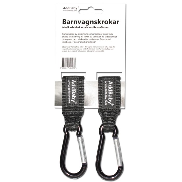 AddBaby Barnvagnskrokar är lätta karbinkrokar av aluminium som gör att du enkelt och snabbt kan sätta fast saker du behöver ha lättåtkomligt på din vagn. Fästs med kardborre.