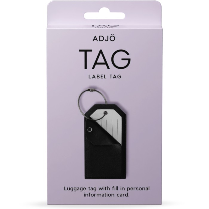 ADJÖ Luggage Tag är en stilren bagagelapp med transparent fönster för personuppgifter. Med en bagagelapp blir den väska lättare att identifiera, vilket kanske gör resan smidigare.