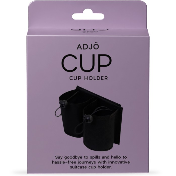ADJÖ Cupholder är en muggbehållare med plats för två drycker samt ett extra fack. Kan monteras på handtagen på din reseväska så att att lätt kan komma åt drycken.