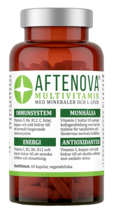 AfteNova Multivitamin är ett kosttillskott med utvalda vitaminer och mineraler samt aminosyran L-Lysin. AfteNova innehåller bland annat syraneutral C-vitamin, D-vitamin, högdoserat B-vitaminkomplex, B12 i den aktiva formen metylkobalamin, zink, koppar och l-lysin.