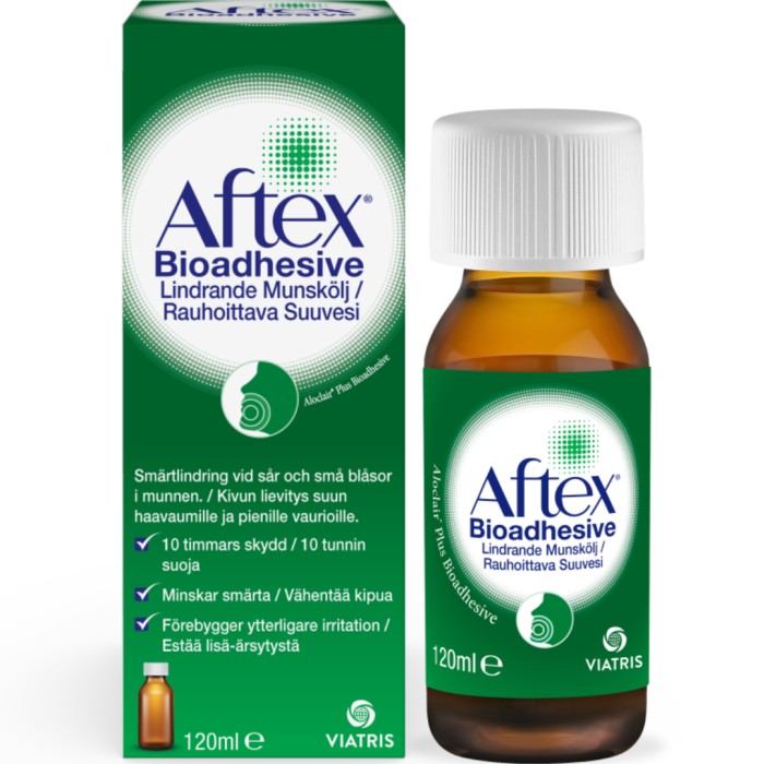 Aftex Bioadhesive Lindrande munskölj verkar på smärtsamma aftösa sår, munblåsor och inflammation i munslemhinnan, mindre sår och skav orsakade av tandställningar och illasittande tandproteser. Aftex munskölj innehåller fuktgivande hyaluronsyra, vårdande aloe vera och irritationslindrande läkemalva.