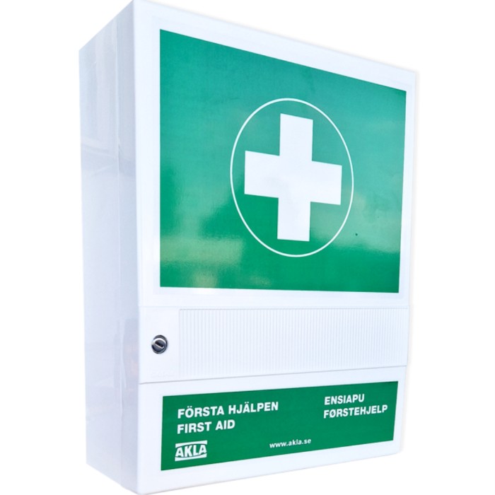 Ett välfyllt förbandsskåp med ett urval av AKLA:s Första Hjälpen-produkter. Skåpet är låsbart och tillverkat av slagfast vit plast med flera hyllor och praktiska fack. Skåpet används med fördel som central Första Hjälpen-plats samt som påfyllningsdepå för övriga Första Hjälpen-utrustningar.