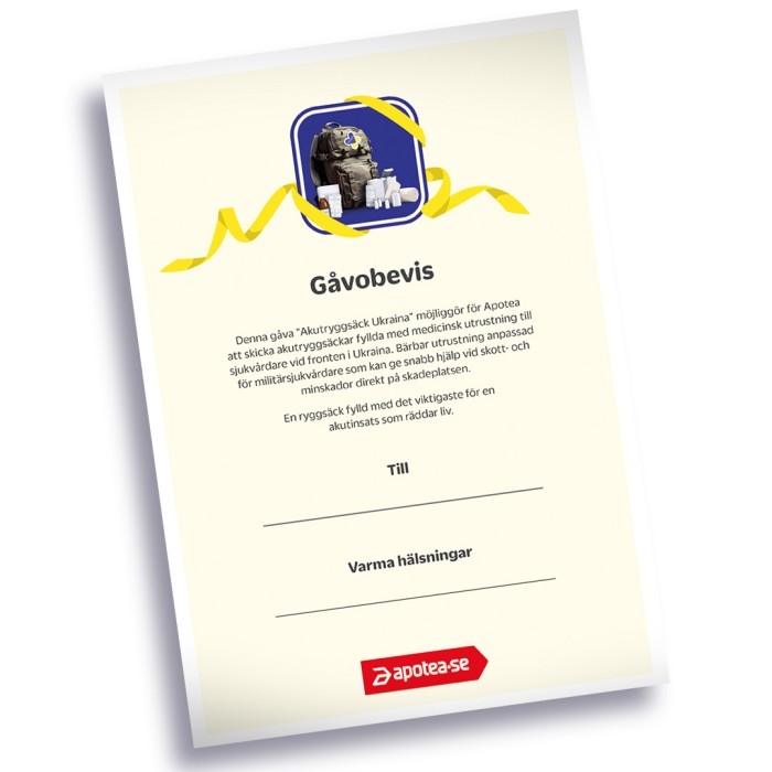 Ge bort en present som räddar liv! När du köper ”Akutryggsäck Ukraina” får du en länk till ett Gåvobevis som du kan skriva ut och ge bort.