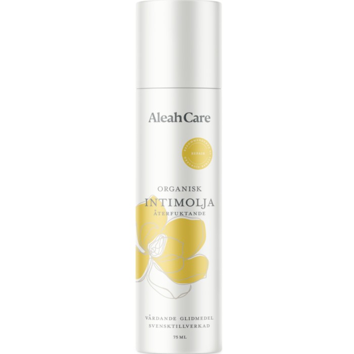 Aleah Care Intimolja (Repair) är ett oljebaserat glidmedel med långvarig återfuktande effekt. Skyddar skonsamt sköra slemhinnor vid omslutande samlag. Intimoljan kan även användas som en vårdande och lugnande intimkräm vid t ex ömhet. Aleah Care Intimolja har en sammansättning av omega 7 och E-vitamin som återfuktar slemhinnan, och fyra kallpressade vegetabiliska oljor av hög kvalitet som tillför näring och vårdar slemhinnan. Rekommenderad av svensk sjukvård och används bland annat inom cancerrehabilitering, vid kronisk underlivssmärta och ärrbildning efter förlossningsskada.