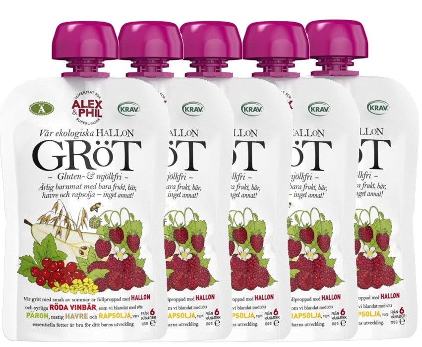 Alex&Phils ekologiska gröt med hallon, röda vinbär, havre och päron.