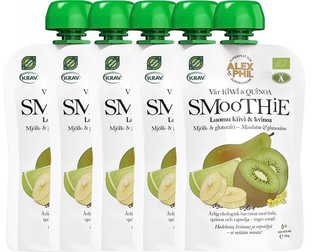I Alex & Phils Smoothie Kiwi & Quinoa har man blandat kiwi, rik på C-vitamin, med päron och banan till en len smoothie. Smoothien innehåller den proteinrika och glutenfria örten quinoa och rapsolja samt en skvätt limejuice för att vara både god och matig, och en naturlig källa till omega 3-fettsyror. Essentiella fettsyror (d v s omega-3- och omega-6-fettsyror) är nödvändiga för att barnet ska växa och utvecklas normalt. Gynnsam effekt uppnås vid dagligt intag av 2 g alfa-linolensyra (ALA) och 10 g linolsyra (LA). Smoothien innehåller 0,4 g ALA och 1,0 g LA. Mjölk- och glutenfri. Vegan-vänlig.