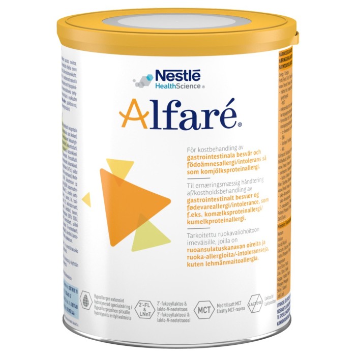 Alfaré® är ett livsmedel för speciella medicinska ändamål för kostbehandling av spädbarn med gastrointestinala besvär och födoämnesallergi/intolerans så som komjölksproteinallergi. Ska användas under medicinsk övervakning.