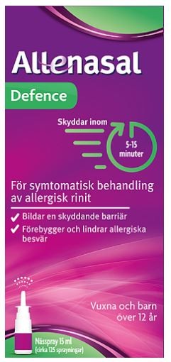 Allenasal Defence är en spray för symtomatisk behandling av allergisk rinit. Sprayen förebygger och lindrar allergiska besvär genom att bilda en skyddande barriär mot pollen.