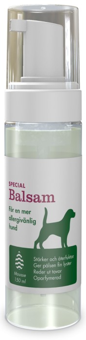 Allergenius Dog Specialbalsam Mousse med ingredienser som vårdar och återfuktar hundens hud, minskar hudirritation samt stärker hudbarriären hos hundar. Balsam-moussen minskar förekomsten av allergiframkallande ämnen, för en mer allergivänlig hund! Balsamet är en "leave in-produkt" som inte ska sköljas ur pälsen och som dessutom ger pälsen fin lyster.