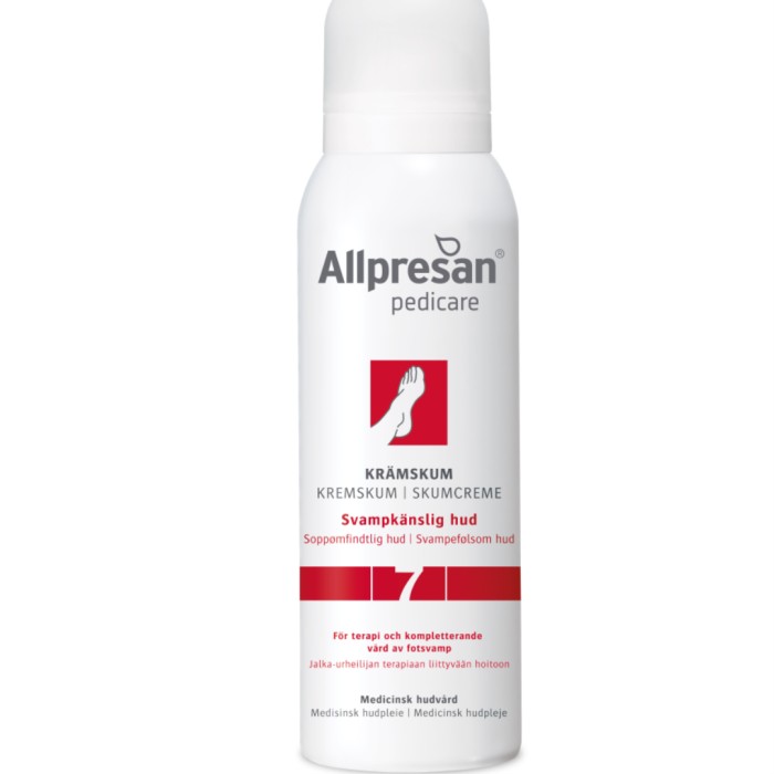 Allpresan Pedicare 7 Svampkänslig hud är en fotkräm för fötter med tendens till fotsvamp. Krämskummet kan användas som kompletterande produkt inom ramen för fotsvampsbehandling.