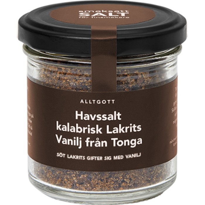 AlltGott Havssalt Lakrits Vanilj är ett havssalt från Trapani, Sicilien som smaksatts med kalabrisk lakrits och vanilj. Detta salt kan du använda när du vill betona mustighet och dra nytta av de djupa mustiga tonerna av örter, tobak och tjära i den kalabriska lakritsen. Den intensiva smaken av lakritsen är tydlig i saltet och den harmonierar fint med doften av vanilj.