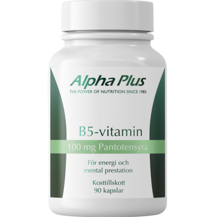 Alpha Plus B5-vitamin är ett kosttillskott som innehåller 100 mg pantotensyra (B5). Pantotensyra bidrar till normal energiomsättning, till normal mental prestationsförmåga samt till att minska trötthet och utmattning. Pantotensyra bidrar även till normal syntes och omsättning av steroidhormoner, vitamin D och vissa neurotransmittorer.
