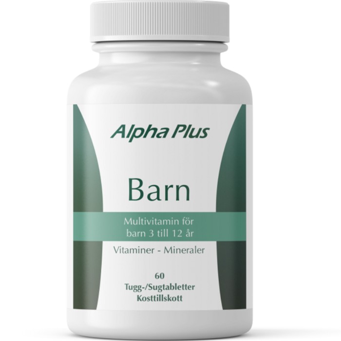 Alpha Plus Barn är en multivitamin med 12 vitaminer och 7 mineraler för barn 3-12 år. Alpha Plus Barn innehåller bland annat D-vitamin som är nödvändigt för att barns benstomme ska växa och utvecklas normalt. Innehåller sötningsmedel.