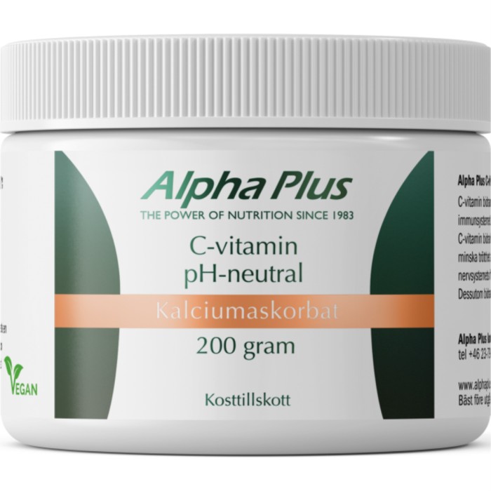 Alpha Plus C-vitamin pH-neutral är ett kosttillskott i pulverform med kalciumaskorbat. Kalciumaskorbat är ett mineralaskorbat, ett kalciumsalt av askorbinsyra.