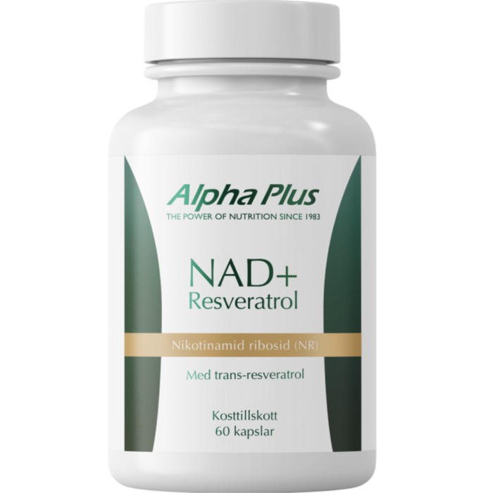 Alpha Plus NAD+ Resveratrol är ett kosttillskott som innehåller Nikotinamid ribosid (NR) som är en form av niacin (vitamin B3). NR är en föregångare till Nikotinamid Adenin Dinukleotid (NAD+). Resveratrol är en växtpolyfenol som förekommer naturligt i flera växter. Denna produkt innehåller resveratrol i form av trans-resveratrol från parkslide.
