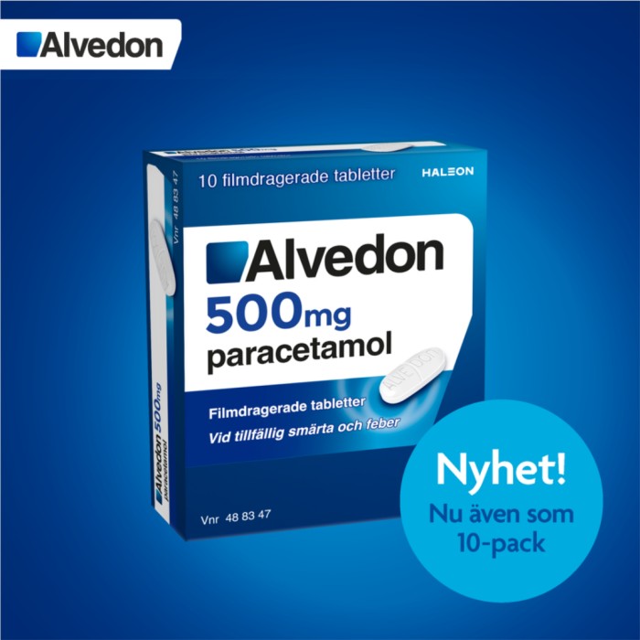 Alvedon 500 mg filmdragerad tabletter innehåller paracetamol som är smärtlindrande och febernedsättande.