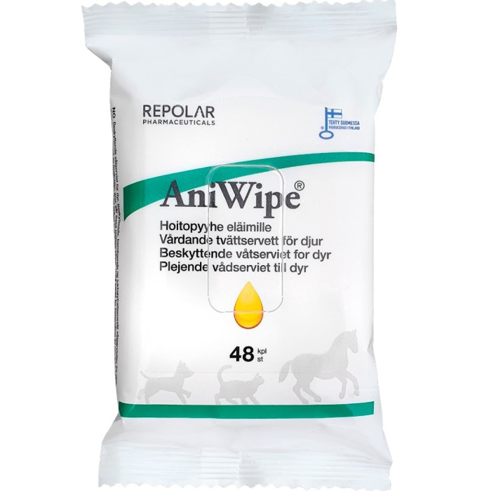 AniWipe tvättservett för djur är en vårdande rengörinsservett som passar att använda i hudveck, tassar, öron samt på hud runt ögon, mun och analöppning. Tvättservetterna rengör och lämnar en skyddande hinna på huden.
